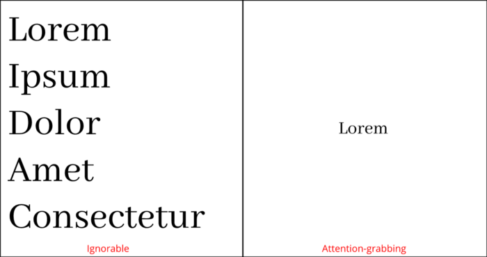 ما اغلب فکر میکنیم رنگهای چشمک زن و فونتهای پررنگ تنها راه جلب توجه به متن است، اما به طرز شگفت انگیزی، فضای سفید میتواند بهترین راه برای جلب توجه بیننده باشد، زیرا نشان میدهد که هر چیزی که در محدوده وسیعی از فضای خالی وجود دارد باید مهم باشد.